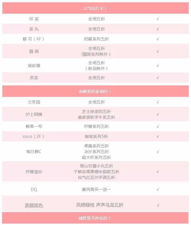 活动时间:2018年12月22日全天 活动地点:海宁银泰城4楼传奇奢华影城 ![]() ![]() 活动时间:2018年12月22日 活动地点:海宁银泰城2楼多奇妙乐园 使用时间:2018年12月22日全天使用 ![]() ![]() 活动时间:2018年12月22日白天档(10:00-18:00) 活动地点:海宁银泰城3楼唛浪KTV 使用时间:2018年12月22日白天档(10:00-18:00) ![]() ![]() 活动时间:2018年12月22日 活动地点:海宁银泰城5楼宾仕豪都保龄球馆 使用时间:2018年12月22日13:00闭店 ![]() ![]() 活动时间:2018年12月22日 活动地点:海宁银泰城5楼鸿翔健身房 使用时间:2018年12月22日全天 ![]() 王牌生日礼 独乐乐不如众乐乐! 锦鲤是他一个人的事情, 现在我们要让大家做锦鲤! ![]() (扫描二维码领取生日礼) 海宁银泰5周年生日, 欢迎大家都来快乐的做锦鲤! ![]() ![]() 12月22日,一折到底 根据不同时间段 当天时间越晚,折扣越大 越夜越嗨,疯狂买买买 最低可至1折!1折! ![]() ![]() 【活动折扣】 ✔10:00-12:59,5.5折 ✔13:00-15:59,4.5折 ✔16:00-17:59,3.5折 ✔18:00-19:59,2.5折 ✔20:00-22:59,1.5折 登录喵街app即可领取资格券 ![]() ![]() 【活动折扣】 ✔9:30-12:00 ,6折 ✔ 12:15-16:00, 5折 ✔ 16:15-19:00,4折 ✔ 19:15-21:00, 3折 ✔21:15-23:00, 2折 ✔23:00-打烊 ,1折 ![]() 登录喵街app即可领取资格券 ![]() 除了上述之外 各种黄金首饰 、化妆品都有大折扣哟 ![]() 你以为就这样了吗? 后面还有大招等着你呢~ 创意美食节--集装箱美食节,年轻人的最爱 50+美食店全线5折~~ ![]() ![]() 海宁银泰城5周年庆典 集装箱美食节,全面升级 13天美食巡展 周一至周五 15:00-22:00 周六-周日 10:00-22:00 20位纯手工艺人 50位美食制作达人 100+款地道美食 1440小时精心打造 ![]() 还没吃过瘾 没关系 场内美食诚意满满 为了庆祝海宁银泰5岁生日 50+家餐饮集体砍腰对折! 内部名单已经曝光 赶紧收藏! ![]() 全军出击的餐饮力度 50+餐饮 全!线!5!折! 5折!5折!5折! 5折!5折!5折! 5折!5折!5折! ![]() 餐饮5折内部名单已曝光 挑一些给你们看看 先诱惑一把! 仅限12.22店庆当天 ![]() ![]() ![]() ![]() ![]() ![]() ![]() ![]() ![]() ![]() ![]() ![]() ![]() ![]() ![]() ![]() ![]() ![]() ![]() ![]() ![]() ![]() ![]() ![]() (水果什锦披萨单折不限量) ![]() ![]() ![]() ![]() ![]() ![]() ![]() ![]() ![]() ![]() 甜蜜饮品5折 时尚小吃5折 全!部!5!折! ![]() 小部分限量5折发售 具体详见专柜明示 记住了吗! 12月22日 不用挑随便进 保证有你想要的优惠 ![]() 看完了后 小编的心里 只有买买买和吃吃吃了~~ 这个圣诞节,约上小伙伴们一起去海宁银泰吧~~ ![]() |