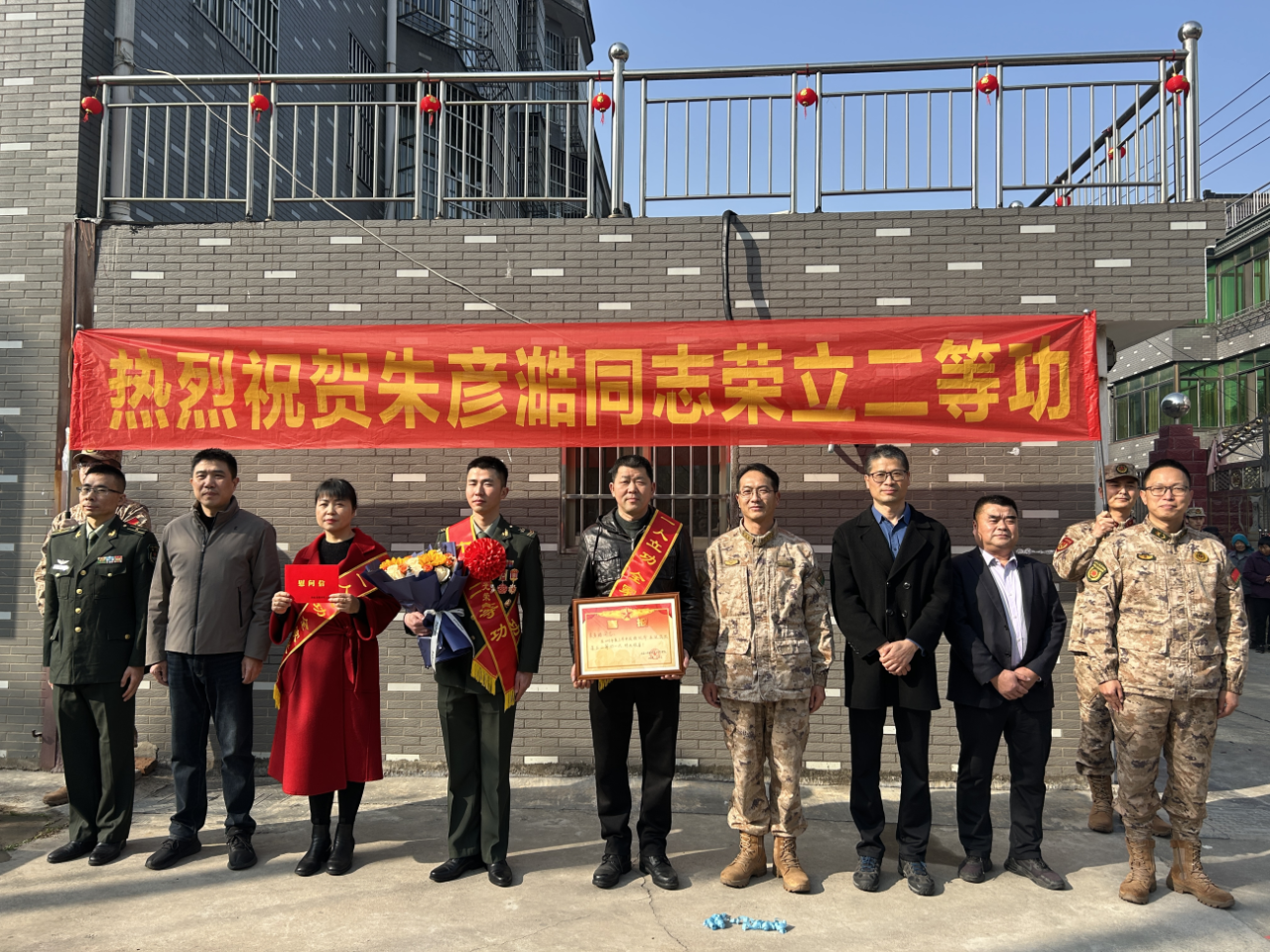 2月13日上午,县委常委、县人武部政委朱兆友带队,专程将二等功喜报送到朱彦澔及其家属手中,县退役军人事务局局长蔡志勇、沈荡镇党委书记戴燕卫陪同。