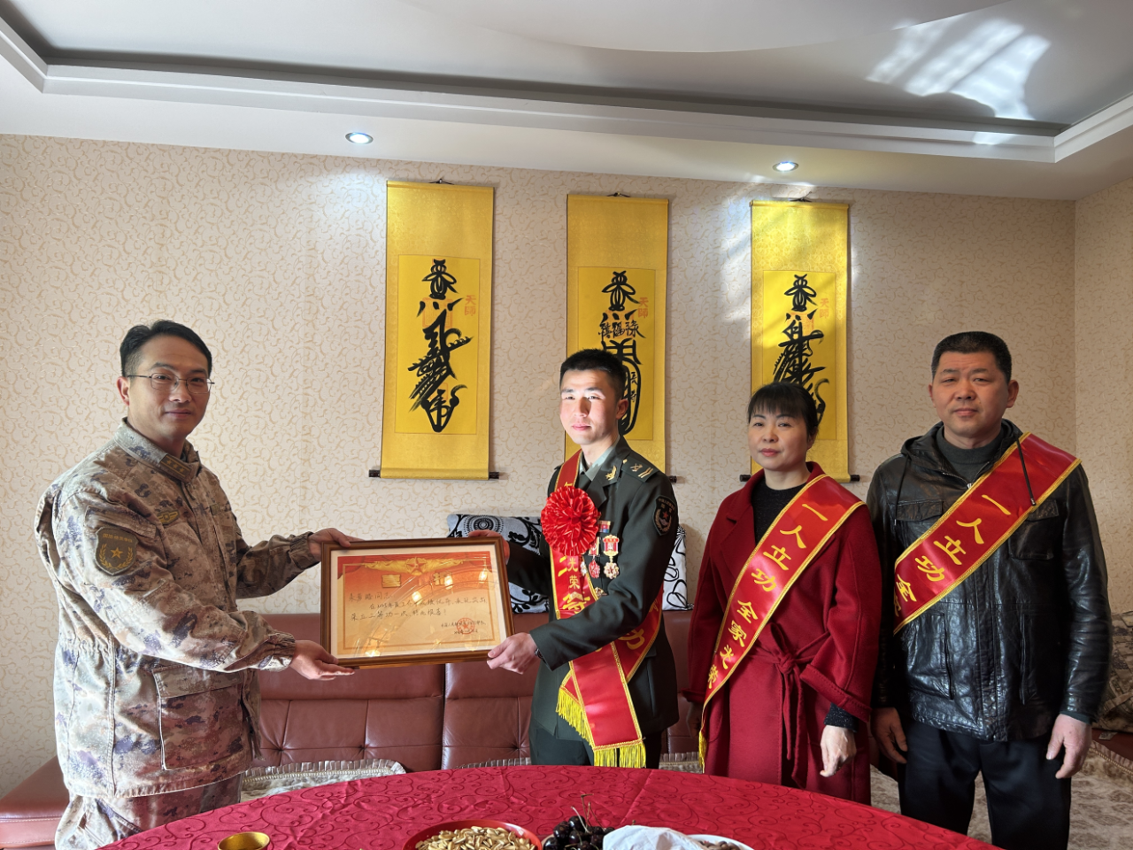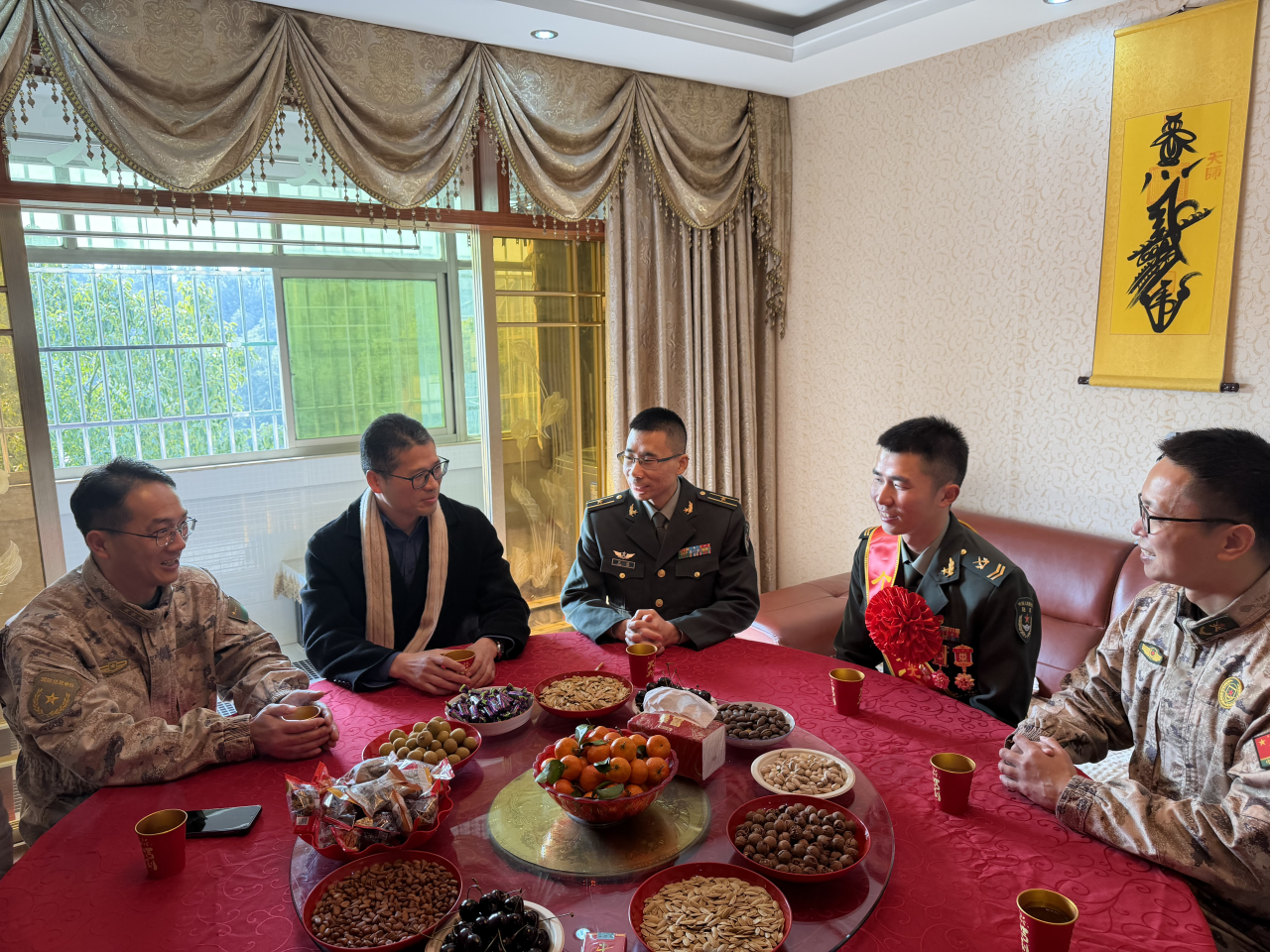 在朱彦澔家中,朱兆友政委一行与军人家属、部队领导亲切座谈。部队教导员张楠详细介绍了朱彦澔在部队的训练、工作实绩及立功事迹,对其过硬的军事素质和优异表现给予充分肯定。朱兆友政委向朱彦澔及其家属表示热烈祝贺,希望家属继续支持子女安心服役、再立新功。朱彦澔表示,将始终牢记党和人民的嘱托,扎根军营、奋勇争先,以更优异的成绩为家乡争光、为军旗添彩。