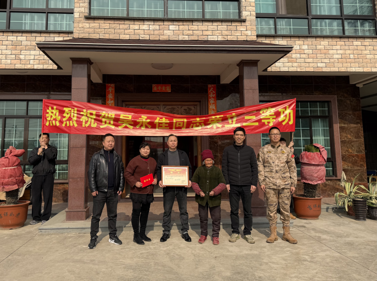2月11日上午,县退役军人事务局副局长张喜平、沈荡镇人武部部长朱聪聪以及中钱村村委会相关人员,共同将三等功喜报送到吴永佳家属手中。